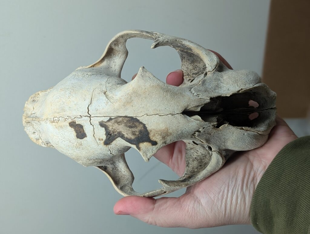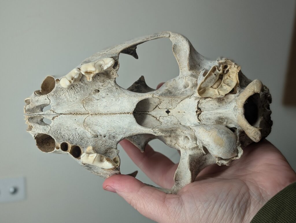 Sourced from an old estate, this is a neat nature-cleaned upper skull of an adult specimen in craft-quality condition. It has several good teeth intact. Please review all pictures and description for condition.