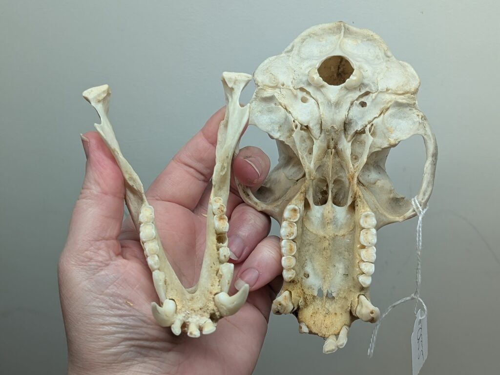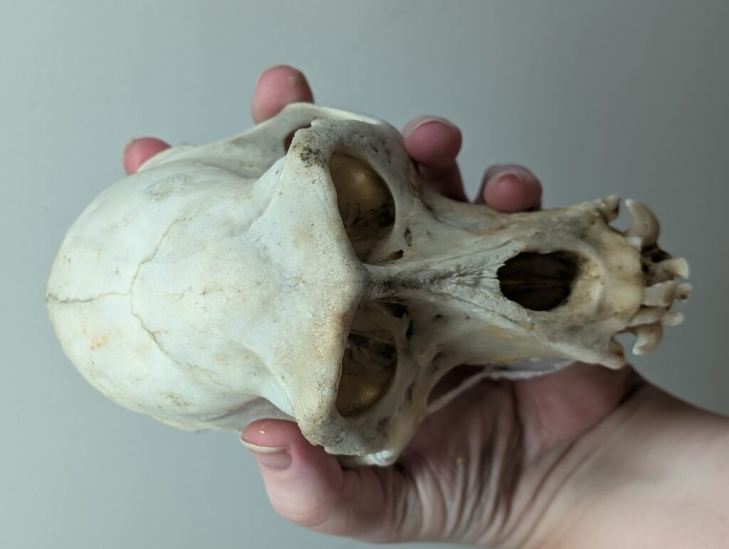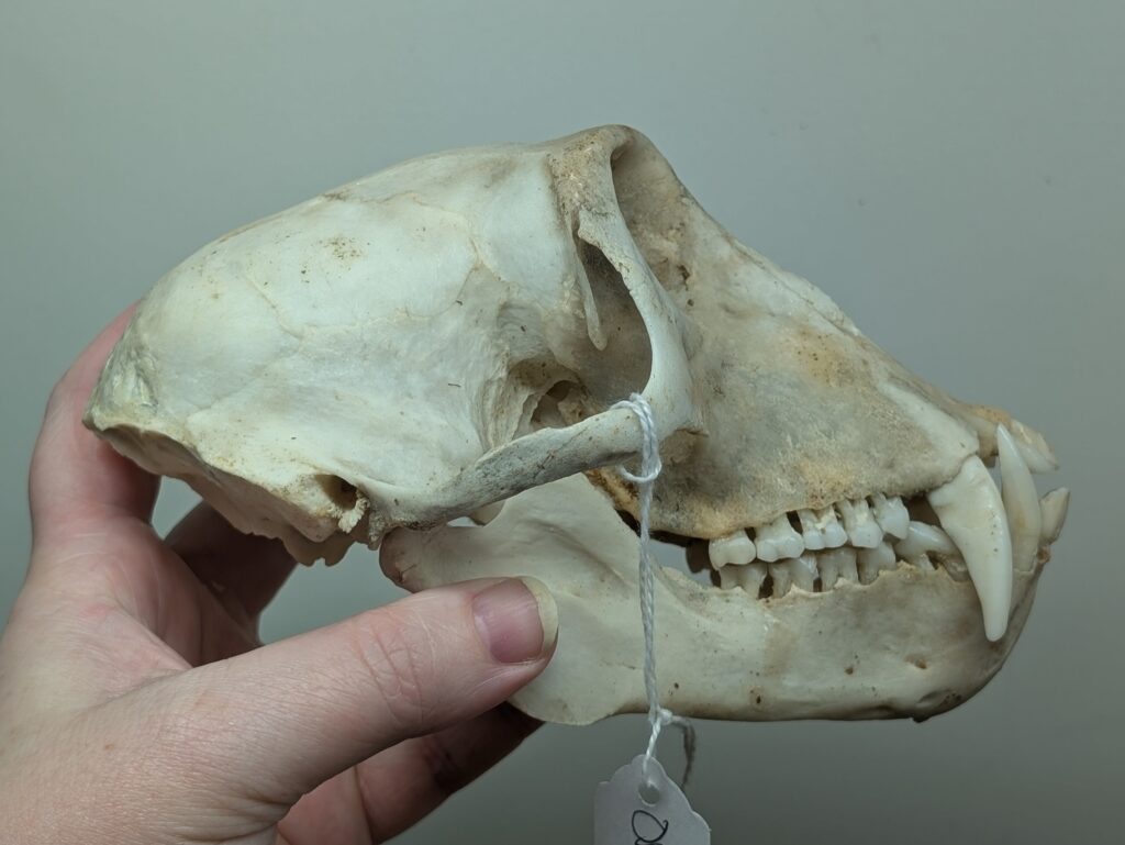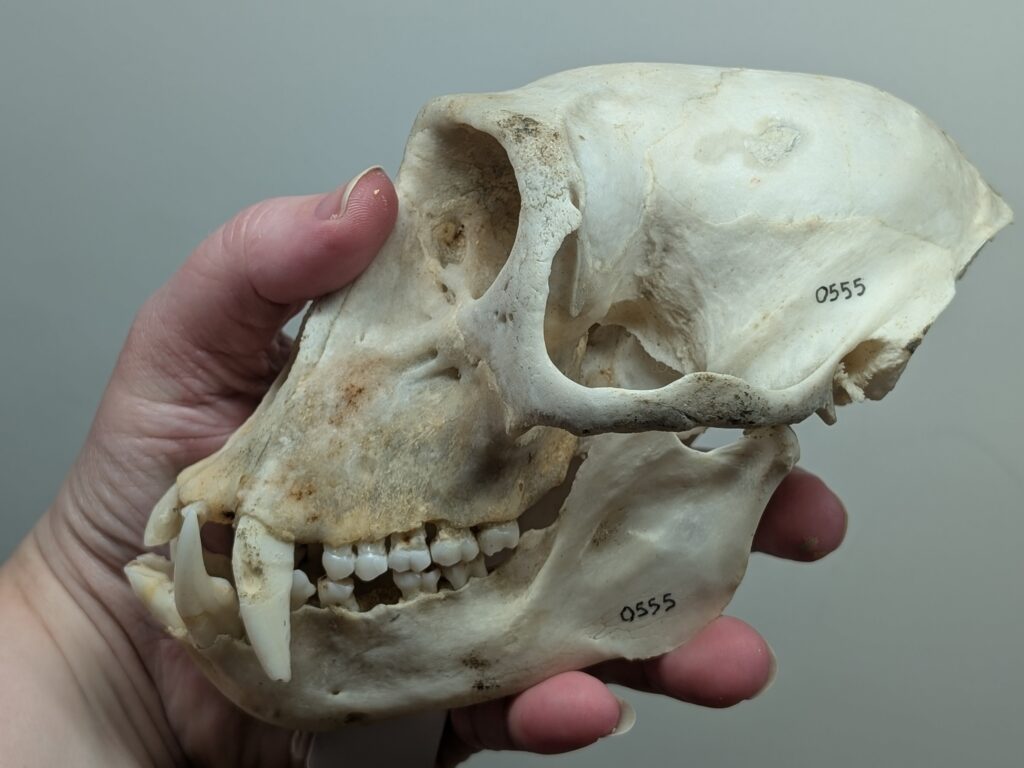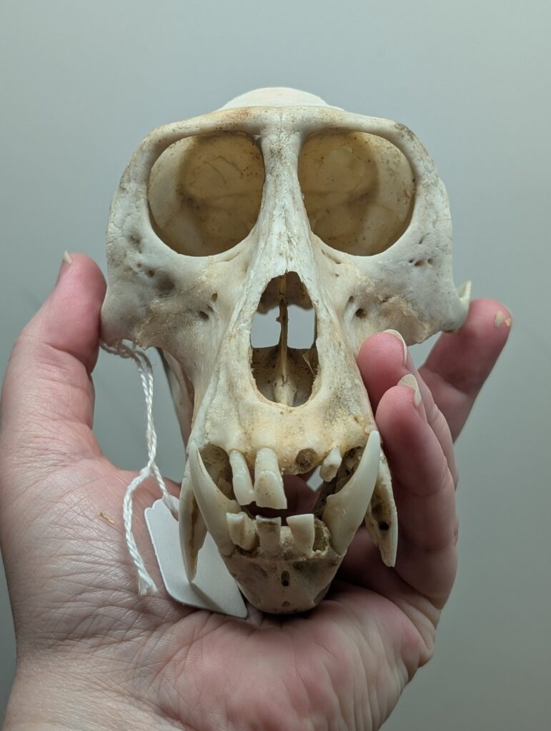 Sourced from a US collection, this is an impressive large male example of the rare species with large canine teeth. It could use further cleaning and there is a repaired hole on the cranium, but is a great example overall. lease review all pictures and description for condition.