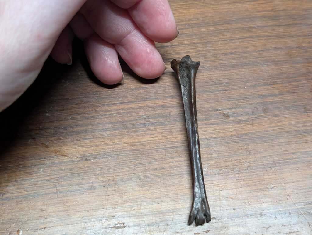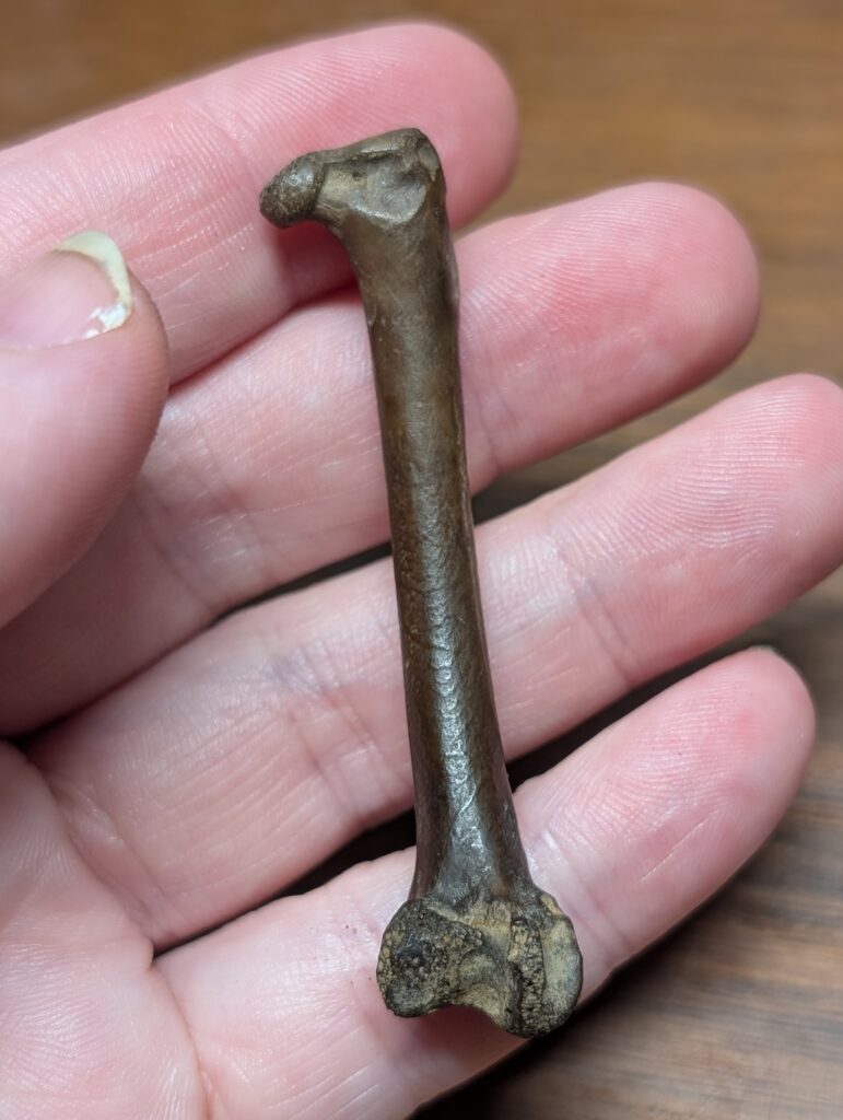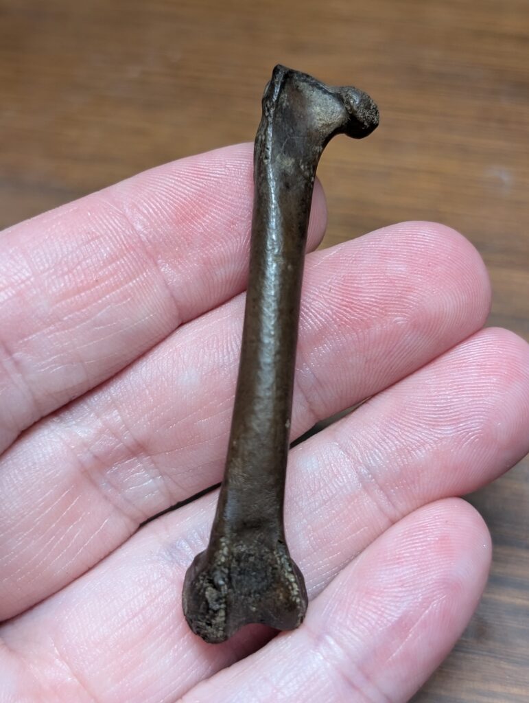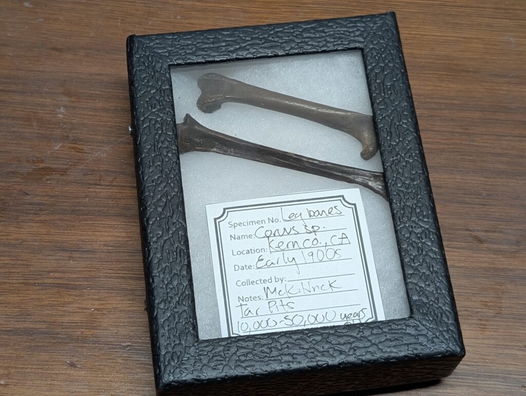 A rare opportunity! This is a pair of fossil leg bones (one femur and one tarsometatarsus, not associated) from a Pleistocene fossil corvid species. Sourced from an old collection, these specimens were originally collected decades ago from the McKittrick Tar Pits. The exact species is unknown, but there were at least three Corvus species found at the site.